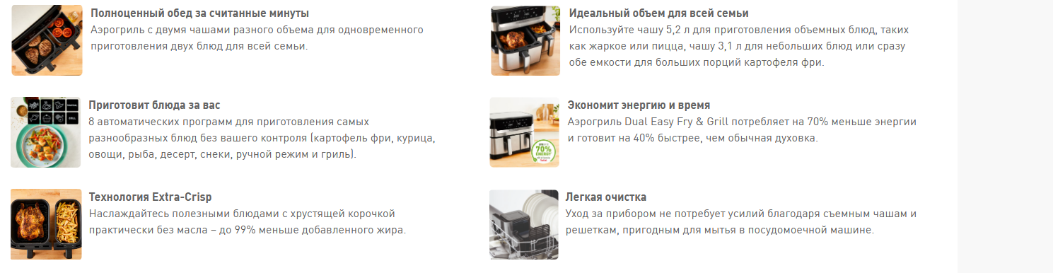 Приготовьте полноценный обед для всей семьи в аэрогриле Dual Easy Fry & Grill с двумя функциональными чашами для разных блюд. Используйте большую чашу объемных ингредиентов, а малую чашу для небольших блюд, или сразу обе емкости для огромных порций картофеля фри. Восемь автоматических программ позволяют готовить мясо с овощами на гриле и в аэрогриле, обжаривать рыбу, выпекать пиццу и десерты, а также делать полезные снеки без необходимости постоянного контроля над процессом приготовления. Начните готовить в аэрогриле Dual Easy Fry & Grill и наслаждайтесь вкусными блюдами с аппетитной хрустящей корочкой каждый день!
